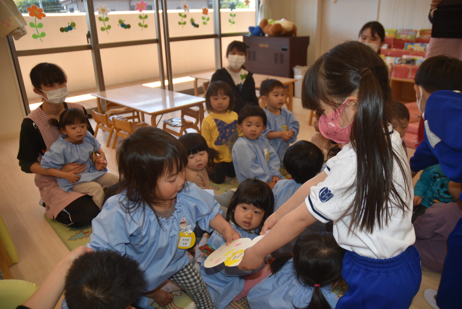 乳児組さんのお部屋にもぞう組さんがプレゼントを渡しに行き、これから一緒に遊んだりお話できることを楽しみにしている姿が見られました。これからどんな楽しいことが待っているかな? 1年間宜しくお願いします。