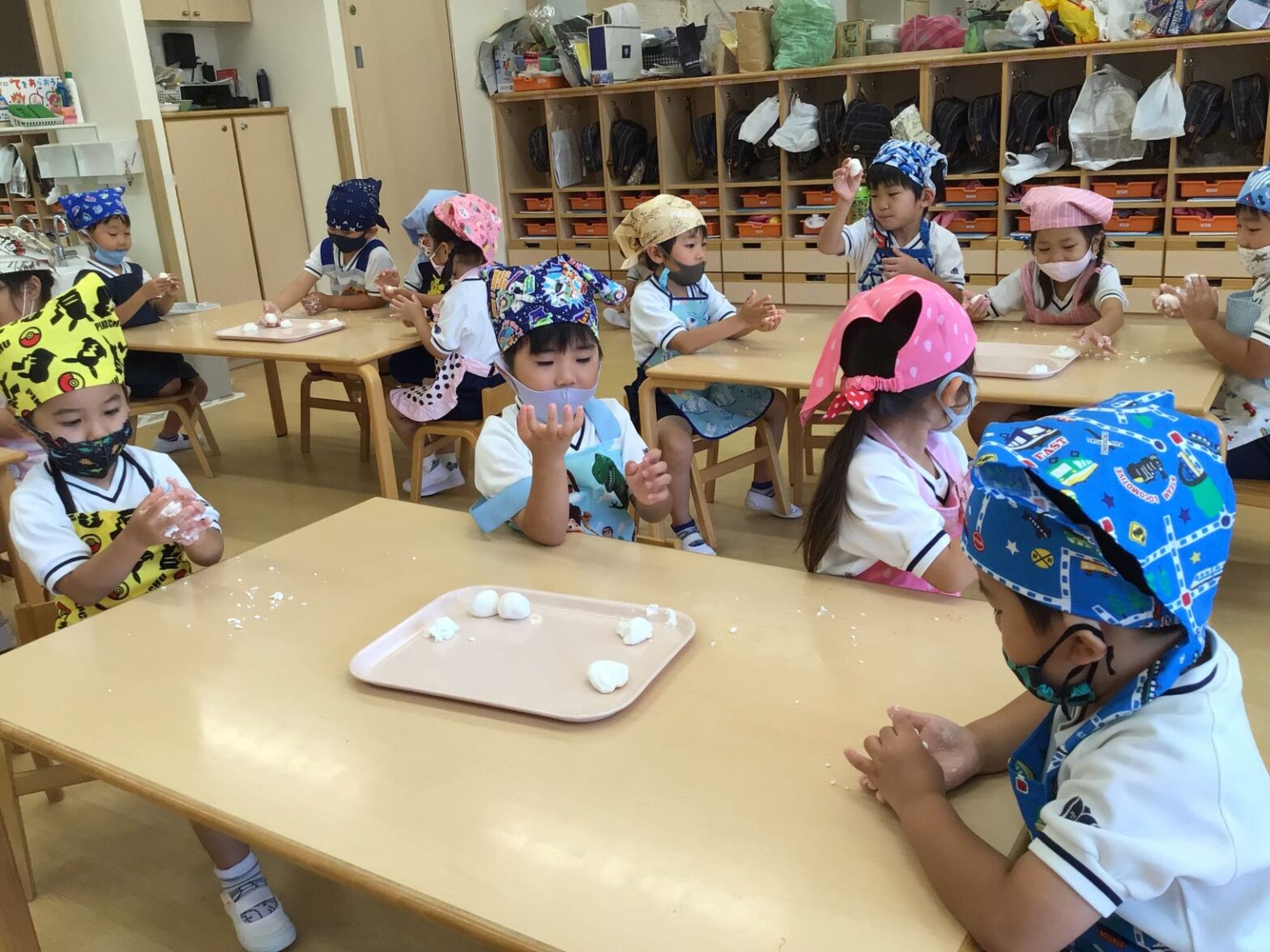 栄養士の先生と一緒にひつじ組のみんなでお月見団子を作りました。上新粉をお湯でといたものを混ぜた後に、みんなで丸くまるめてお団子の形にしました‼つくっている途中にフワフワのお団子を見て「おいしそうだね♡」とちょっぴり食いしん坊なひつじ組さん♪みんな上手に丸めることができました♪お月様に見立てた黄色いお団子にはカボチャを混ぜ合わせています。夜にはきれいなお月様が見えると良いですね♡