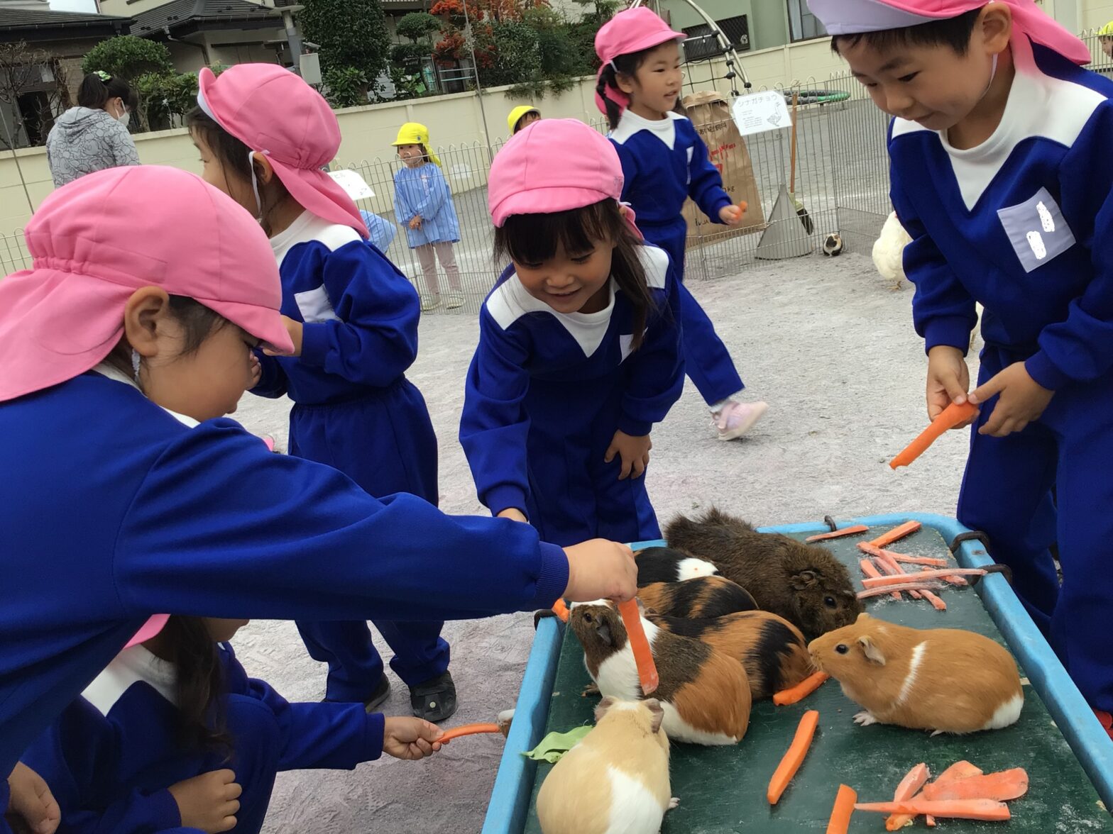 動物村 こども園に動物村がやってきました!なかなか触れる機会のない動物たちに子どもたちは大興奮!うさぎやモルモットを抱っこしたり、鶏を頭や肩に乗せたり、ヘビを首に巻いてニコニコでした。年長組はポニーにも乗せてもらい、カッコよかったです。エサもあげてたくさん触れ合い、良い経験となりました。