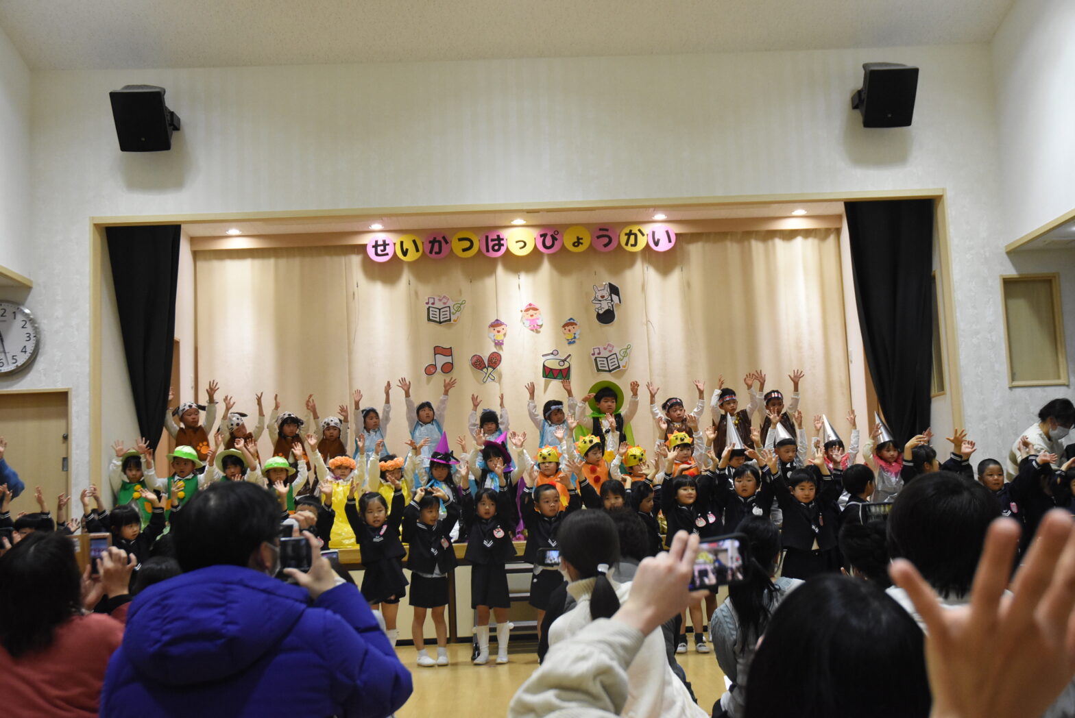 生活発表会 本日幼児組の生活発表会を行いました。うたや合奏、オペレッタなどを行い、始まる前は緊張していた子も、本番ではクラスのみんなと力を合わせ、とても素敵な姿を見せてくれました。お家の方の拍手に励まされいつの間にか緊張もほぐれたようで、キラキラの笑顔が輝いていました。