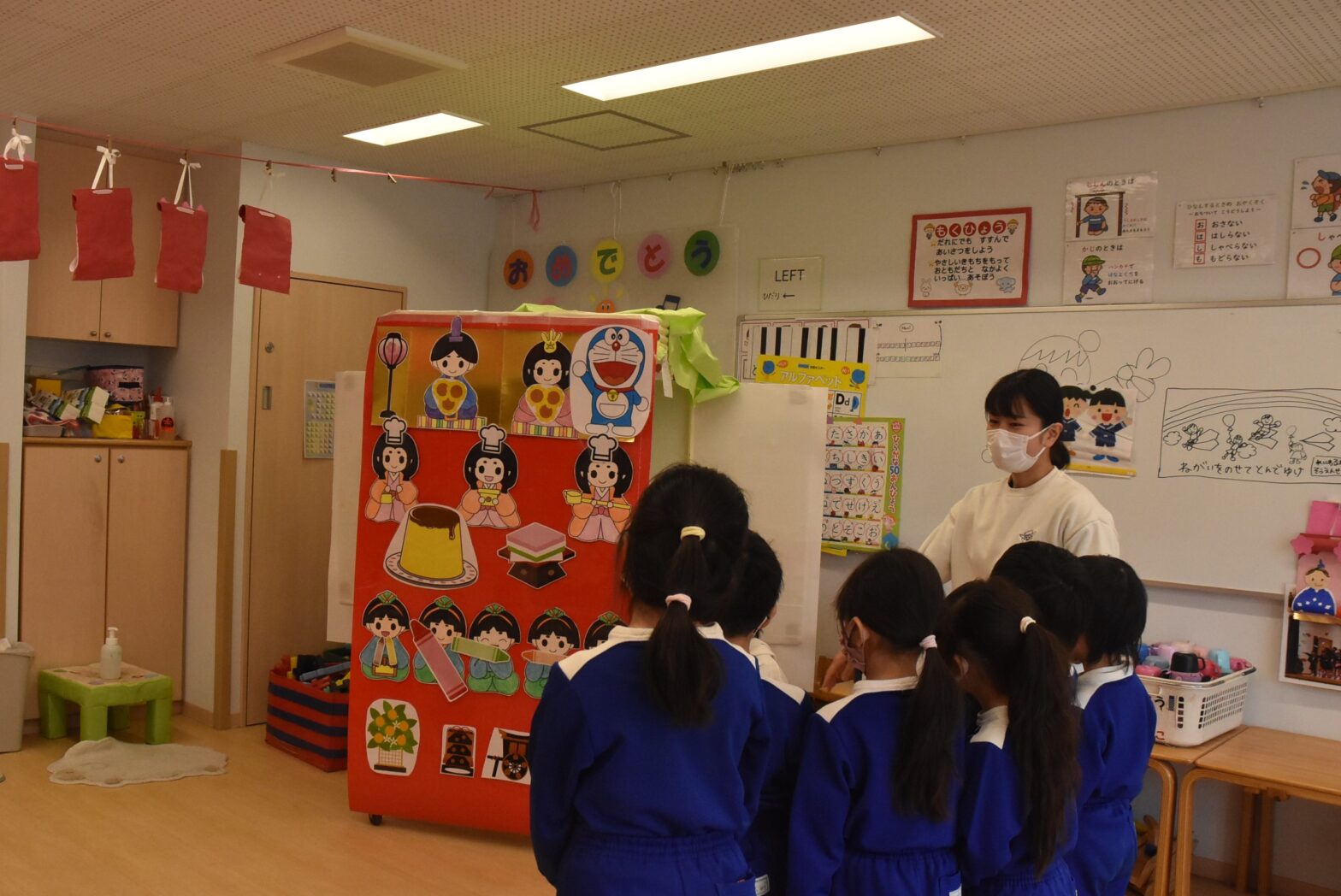 ひな祭り会 今日は3月3日。こども園でもひな祭り会を行いました。由来のお話を聞いたり、間違い探しゲームをして楽しみました。ゲームでは、菱餅がプリンになっていたり、桃の花がクリスマスツリーになっていてみんな一生懸命に探してくれました。給食はひな祭りメニューでちらし寿司でした。子どもたちは「おいしいね!」とニコニコでした。