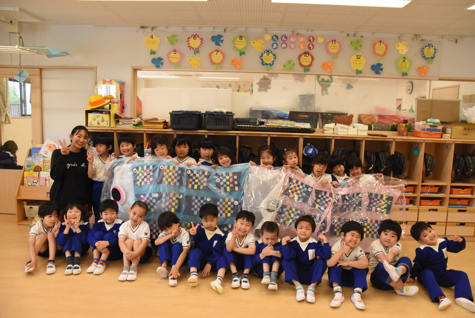 子どもの日を祝う会を行いました。 こどもの日を祝う会は、各クラスで行いました。由来の話を真剣に聞いたり、兜を被っているのは誰先生?クイズでは、元気に答えて大盛り上がりでした。各クラスのこいのぼり制作は、春色でウキウキと心が弾みますね。各保育室前とエントランスにこどもの日まで掲示しております。是非、ご覧ください!