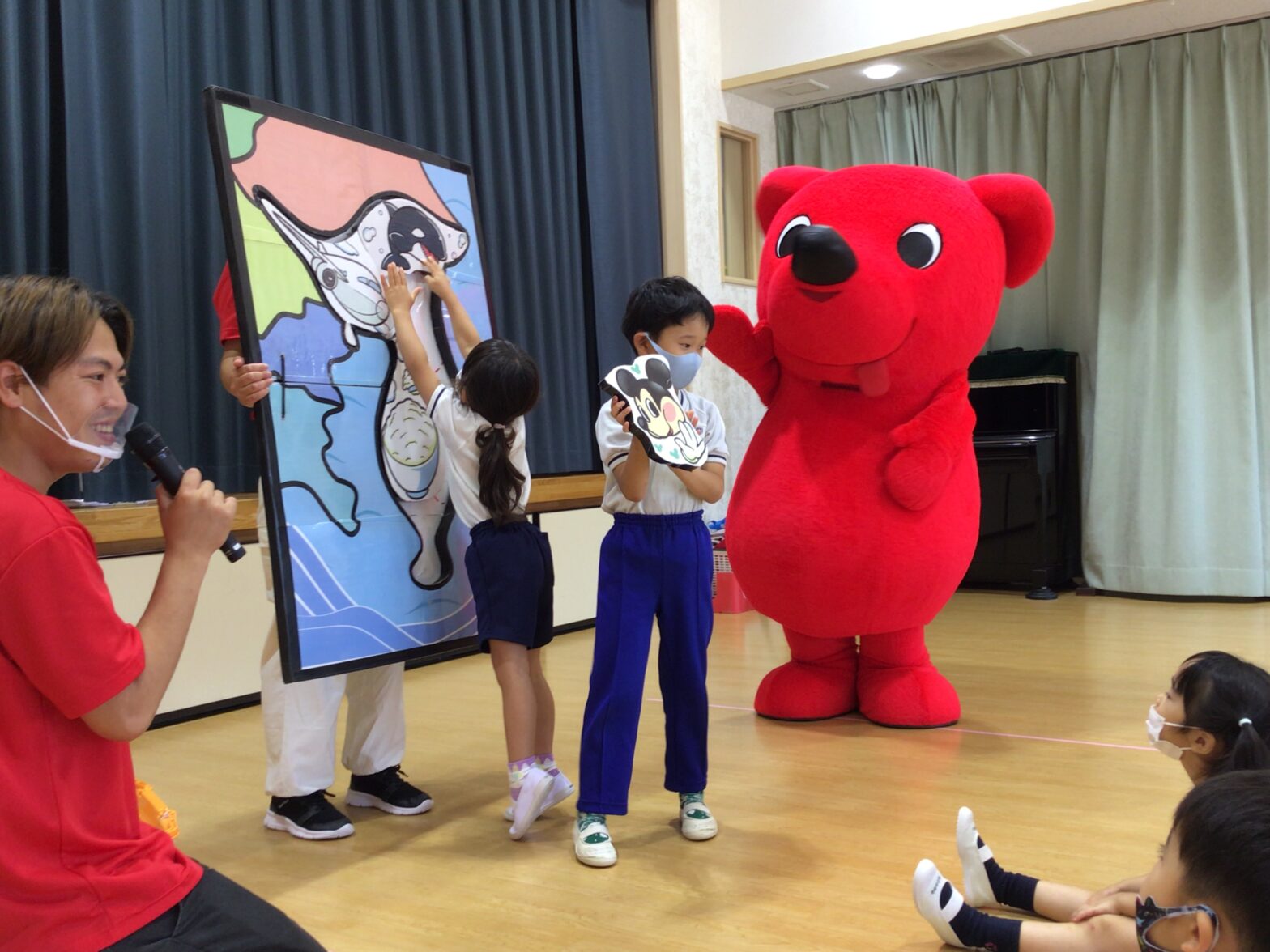 チーバくんと遊ぼう! 今日はチーバくんがこども園に遊びに来てくれました。「チーバくんだ~!!」と、登場すると大喜びの子どもたち!!感染対策をして「ラララ体操」を一緒に踊ったり、千葉県のパズルに参加したり、楽しい時間を過ごしました♪野田市の場所もバッチリ覚え、また会えるのを楽しみにしている子どもたちです!