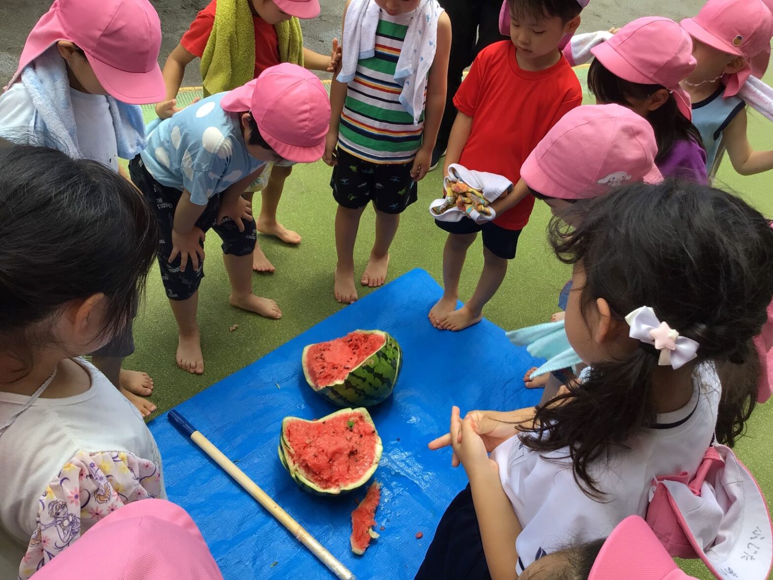 朝はカレー作りから始まり、お気に入りのエプロンと三角巾を身に着けて「じゃがいも」、「なす」、「ズッキーニ」を包丁で切りました。その後、保育室に戻りお菓子をもらおうとしたら…なんとスパイにとられてしまいました。ミッションゲームと謎解きを行い、無事に取り返すことができました☆スイカ割りでは、みんなで声を掛け合い、元気パワーで力いっぱい叩き、大きなスイカを割ることができました。みんなの願いが空に届いたのか、晴天の中水遊びもダイナミックに楽しむことができました‼給食では、自分たちで切った具材が入っていたので「美味しい~♡」と大満足の子どもたちでした。