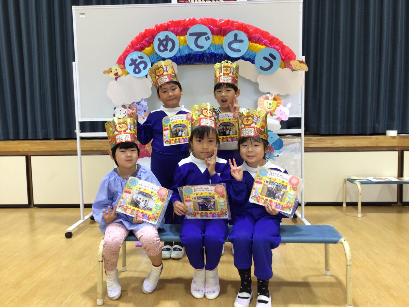 今日は、11月生まれのお誕生日会の後に七五三の会を行いました。「みんなげんきで七五三」のシアターを見た後に、七五三クイズを楽しみました。行事の由来やどのような願いが込められているのかなど楽しく知ることができました。「先生の七五三写真クイズ」では、写真を良く見て、誰先生なのかが当たると大喜び!!掲示した写真をもとに答え合わせをしました。