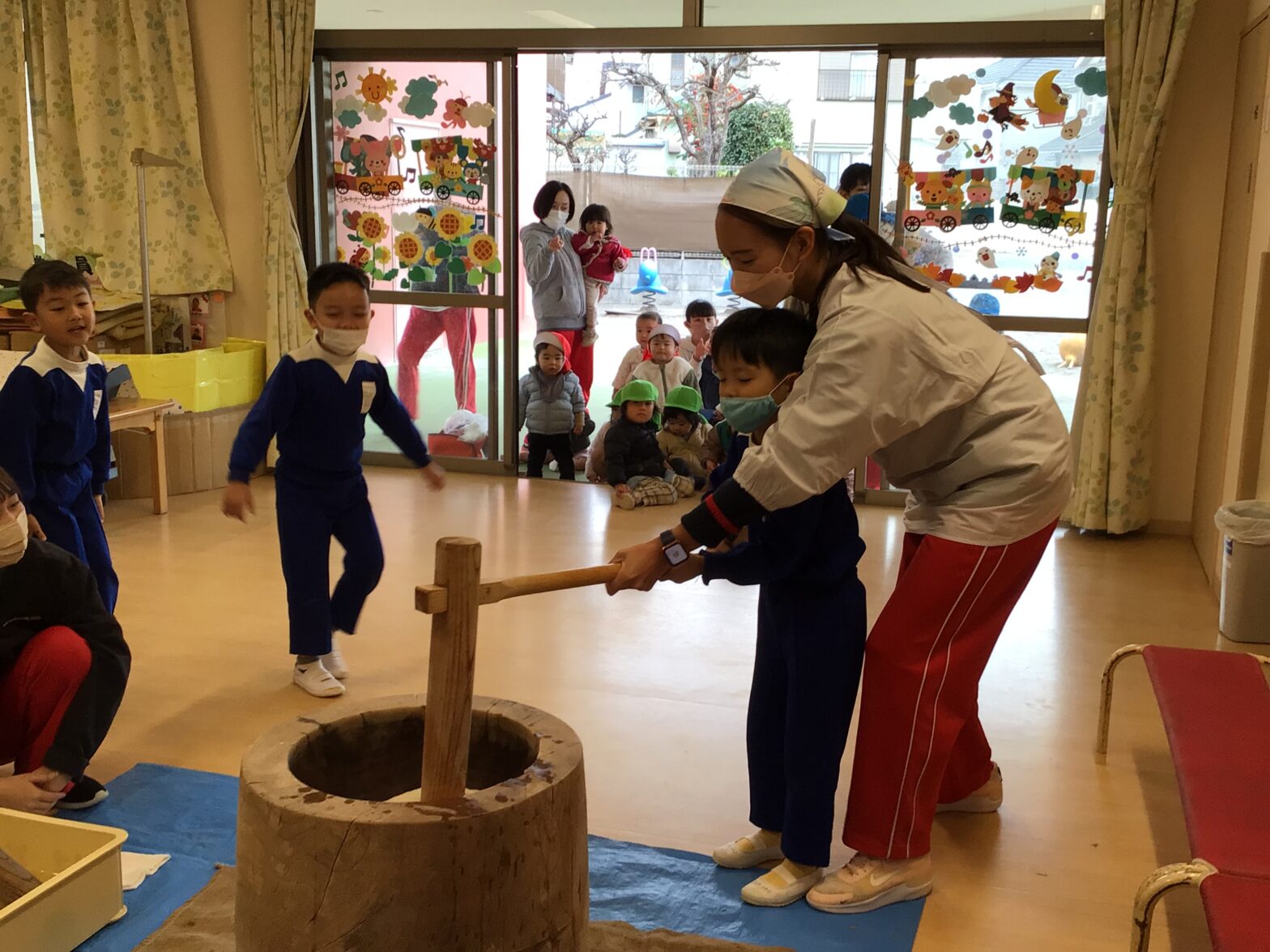 今日はお餅つき会を行いました。幼児クラスのお友だちは、お餅つきをする理由やいつも食べているうるち米ともち米の違いについて話を聞き、お餅つきをしました。みんなで「よいしょー!」と掛け声を掛けて一生懸命にお餅をついたので、とても美味しそうなお餅が出来ました!乳児クラスのお友だちもお餅つきの道具を近くで見たり、お兄さんお姉さんのお餅つきの応援をして一緒に楽しみました。良い年を迎えられますように✩