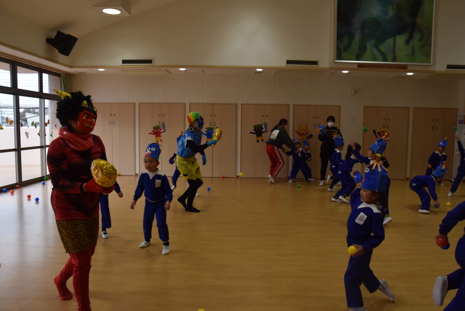 節分の会を行いました。0、1歳児は、保育室で担任の先生と豆まきをしたり「節分」のお話を聞きました。幼児クラスと2歳児は由来クイズをして楽しみながら「節分」について知ったり、当てっこシアターを見ました。鬼役の先生が出てくると泣いてしまう子もいましたが、豆に見立てたボールで「おにはそと、ふくはうち!」と向かっていく子もいました。みんなの中の弱い鬼を退治して、今年も元気に過ごせますように!