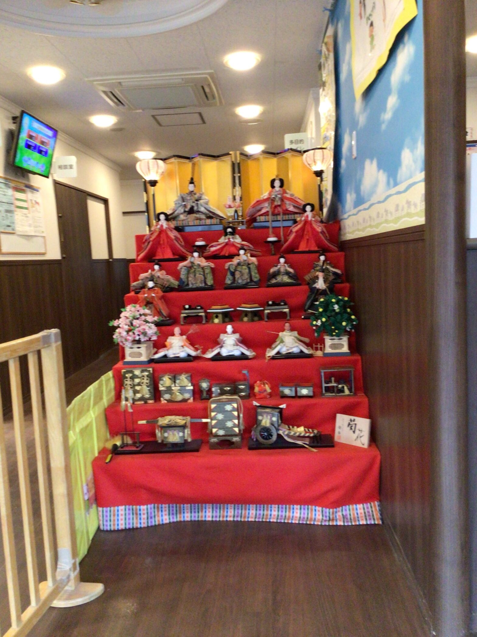 2~5歳のお友だちは遊戯室に集まりました。ひな祭りの由来や食べ物の意味について話すと「知ってるよ!」と教えてくれる子もいました。各クラスの制作を飾ったボードを見ながらどのように作ったのか話すと、「すごい!」と言ったり興味津々で見たり、様々な反応が見られましたよ。間違い探しクイズでは代表のお友だちに前に出てもらい、ひな人形の持っている道具や置物が変わっている所を当ててもらいました。見ているお友だちも「あった!」「ここが違うよー!」「そこだよ!」と沢山教えてくれました!ひな祭りをみんなで楽しみましたよ♪