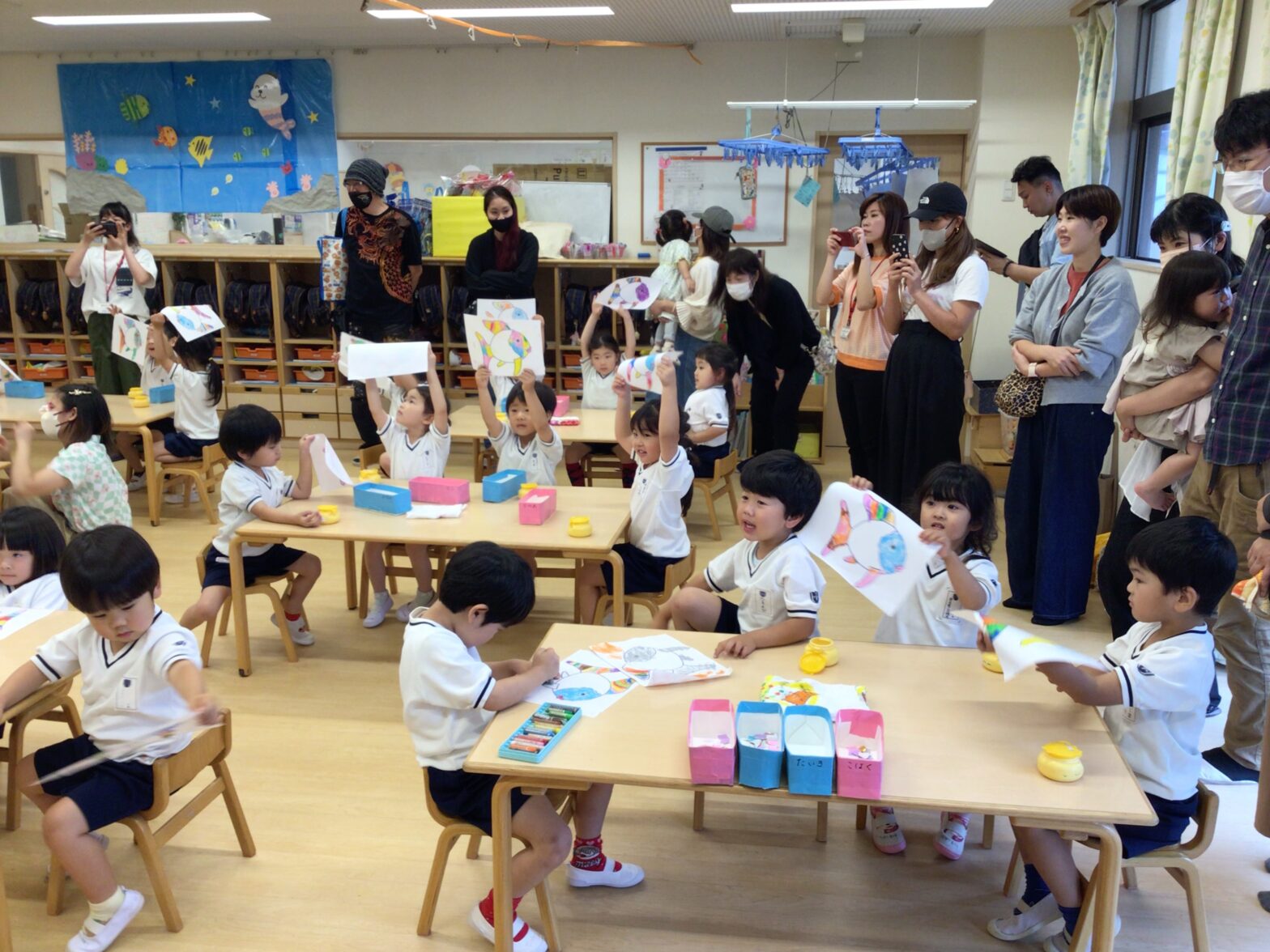 6月12・13日に4歳児フリー参観を行いました。おうちの方が見に来てくれることをとても楽しみにしていたひつじ組さん。いつも以上に張り切って頑張る姿がありました。朝の会では緊張感が見られましたが大きな声でお返事をしたり、季節の歌を元気いっぱいに歌うことができました。また、「にじいろのさかな」をテーマにした制作では、ハサミや折り紙、クレヨンを使いとてもきれいな作品ができあがりました。保育参観へのご参加ありがとうございました。