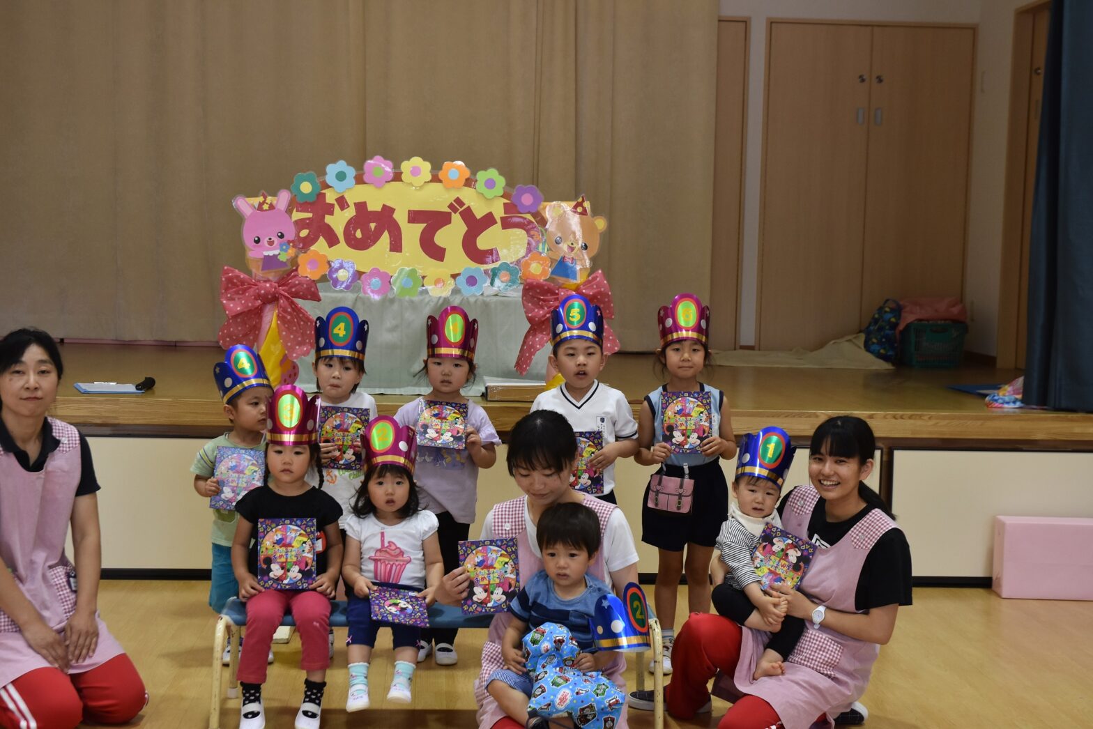 5月 お誕生日おめでとう 今日は、5月生まれのお友だちの誕生日会がありました。上手にお歌やお名前をいうことができましたね。出し物では、大きな箱の中から色々なものが出てきて、興味津々の子どもたち!最後には、大きなケーキが出てきて大喜びでした。