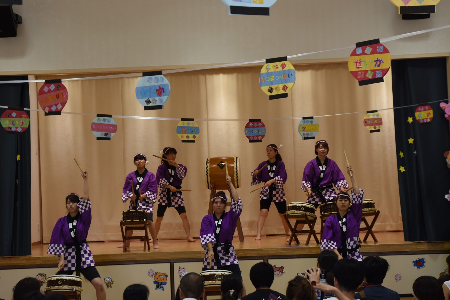 夏祭り会 本日、夏祭り会を行いました。子どもたちは、素敵な浴衣や甚平を着て、お家の方と一緒に嬉しそうに登園してきましたね。 会ではダンスを踊ったり、先生の和太鼓演奏を見た後は縁日をまわり、お土産をいっぱい貰い楽しみました。