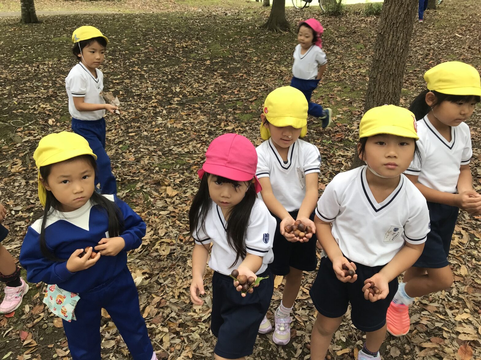 幼児 避難訓練(お散歩) 月曜日に幼児クラスでみずき公園にお散歩に行きました。ぞう組はうさぎ組と手を繋いで向かいました。公園ではどんぐり拾いや落ち葉集め、クラスごとにゲームをして楽しみました。また、散歩中の地震を想定した避難訓練も行いました。焦らず、周りを見ながら自分の身を守ることができました。