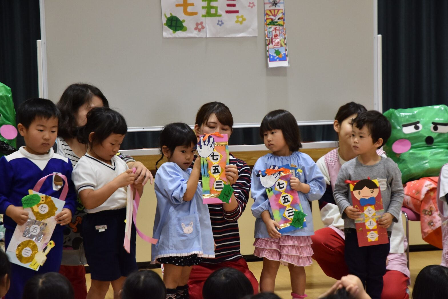 11月の誕生日会 今日は11月生まれのお友だちの誕生日会がありました。「山の音楽家」をみんなで歌ったり、七五三の由来についてのお話も聞きました。各クラスで作った七五三バックの発表をしたり、保育教諭が神主さんに変身し「これからも元気で健康に育ちますように」と願いを込めて神社での参拝の練習をしました。