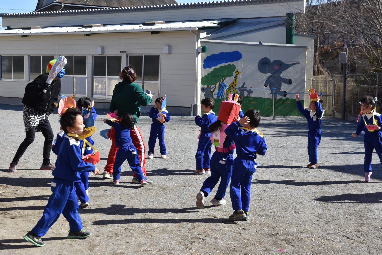 節分 豆まきをこども園で行いました。出し物の「お腹の中には鬼がいる」の劇や節分に関するクイズを興味津々と見ていました。その後は頑張って作った鬼のお面を被っていざ鬼退治です。怖い鬼を目の前にして泣いてしまう子どももいましたが皆で力を合わせて「鬼は外、福は内」と声を掛ける姿は、とても勇敢でした。最後は鬼と仲直りをして写真を撮りました。
