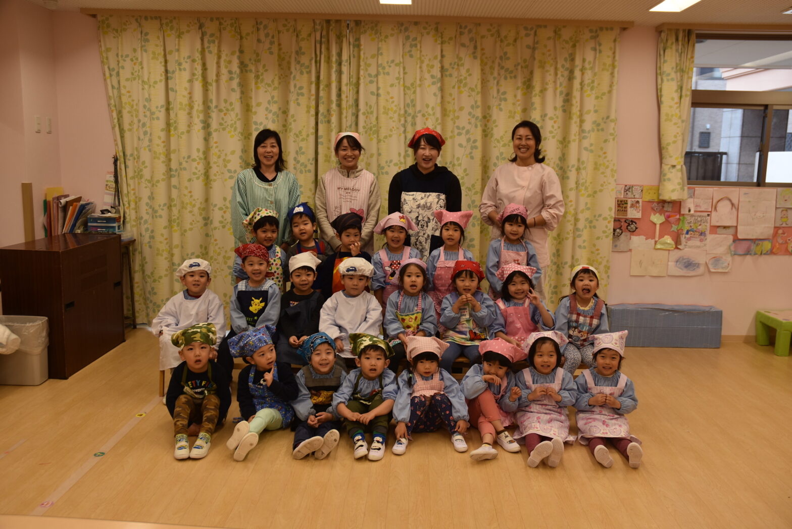 パンケーキ作り 今日は、みんなが楽しみにしていたパンケーキ作りをしました。お気に入りの三角巾とエプロンに着替えてスタート!!ホイップクリームや、チョコソース、イチゴソース、ブルーベリーソースなど自分の好きなものを選びトッピングしました♪仕上げにチョコスプレーをかけたら完成!!自分で作ったパンケーキを「美味しい!!!」と言いながら夢中で食べていました。